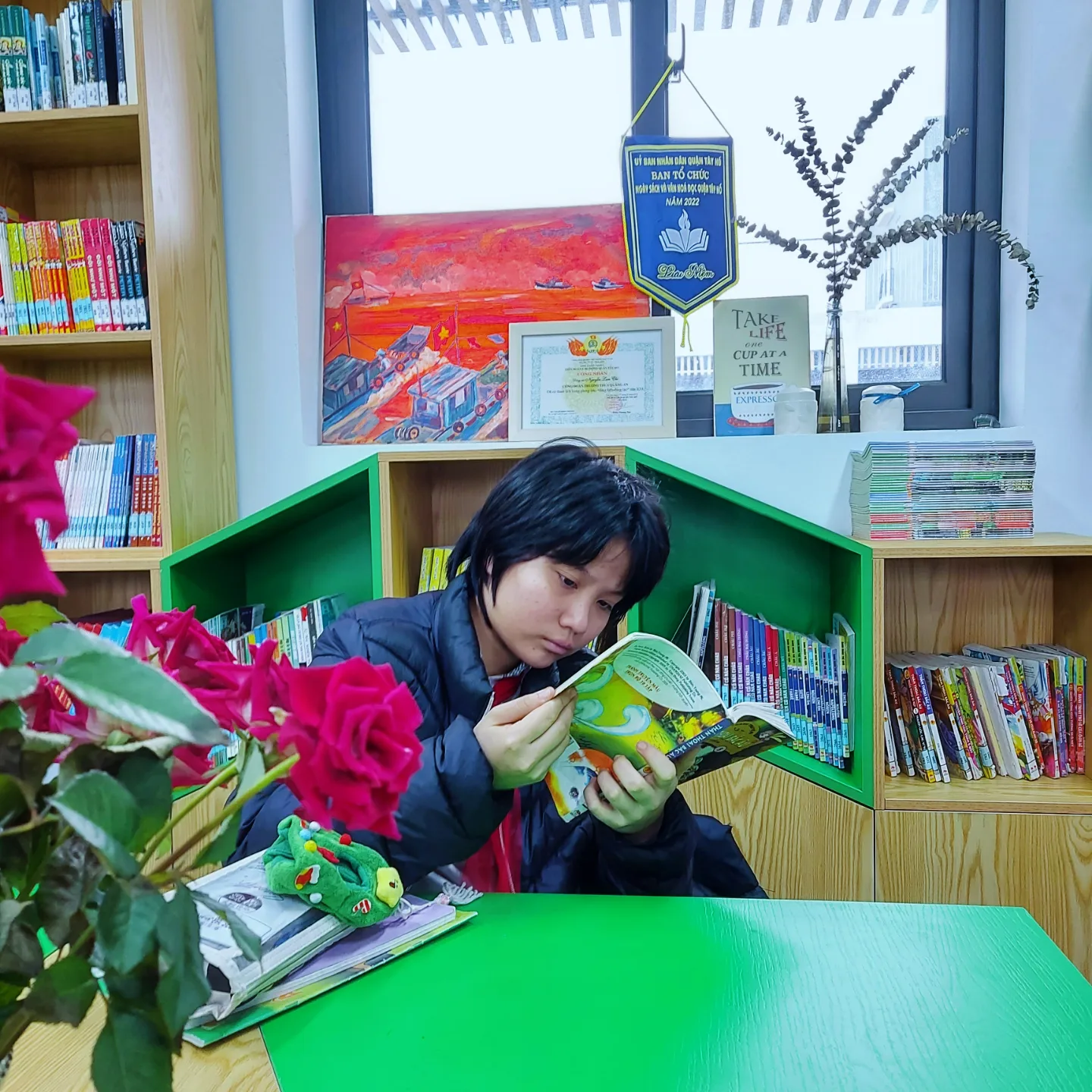 Thư viện là nơi làm việc của cô Thủ thư mỗi ngày, và cũng là "mái nhà chung" của bất cứ bạn đọc đến với thư viện, muốn đọc, muốn học và khám phá thế giới qua những trang sách. Ở đó bạn có thể "gặp lại mình" qua các cuốn sách bạn từng tặng cho thư viện, những chiếc bookmark, những bài vẽ theo chủ đề mà bạn đã từng làm trong tiết học thư viện, bạn sẽ gặp thêm những món quà mà cô tớ được nhận từ chính các bạn nhỏ trong trường, đã từng đến thư viện và trót dành tình cảm cho cô tớ.